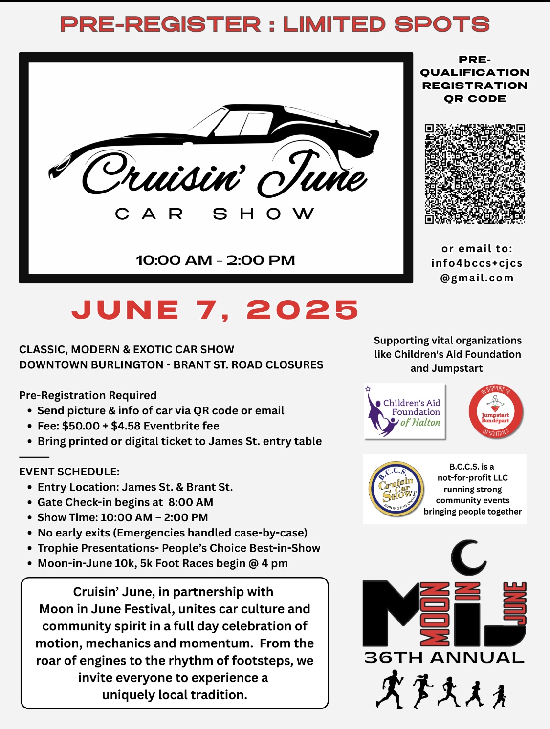 Cruisin’ June Car Show, Moon in June Run. A double feature, it’s gonna be fun!