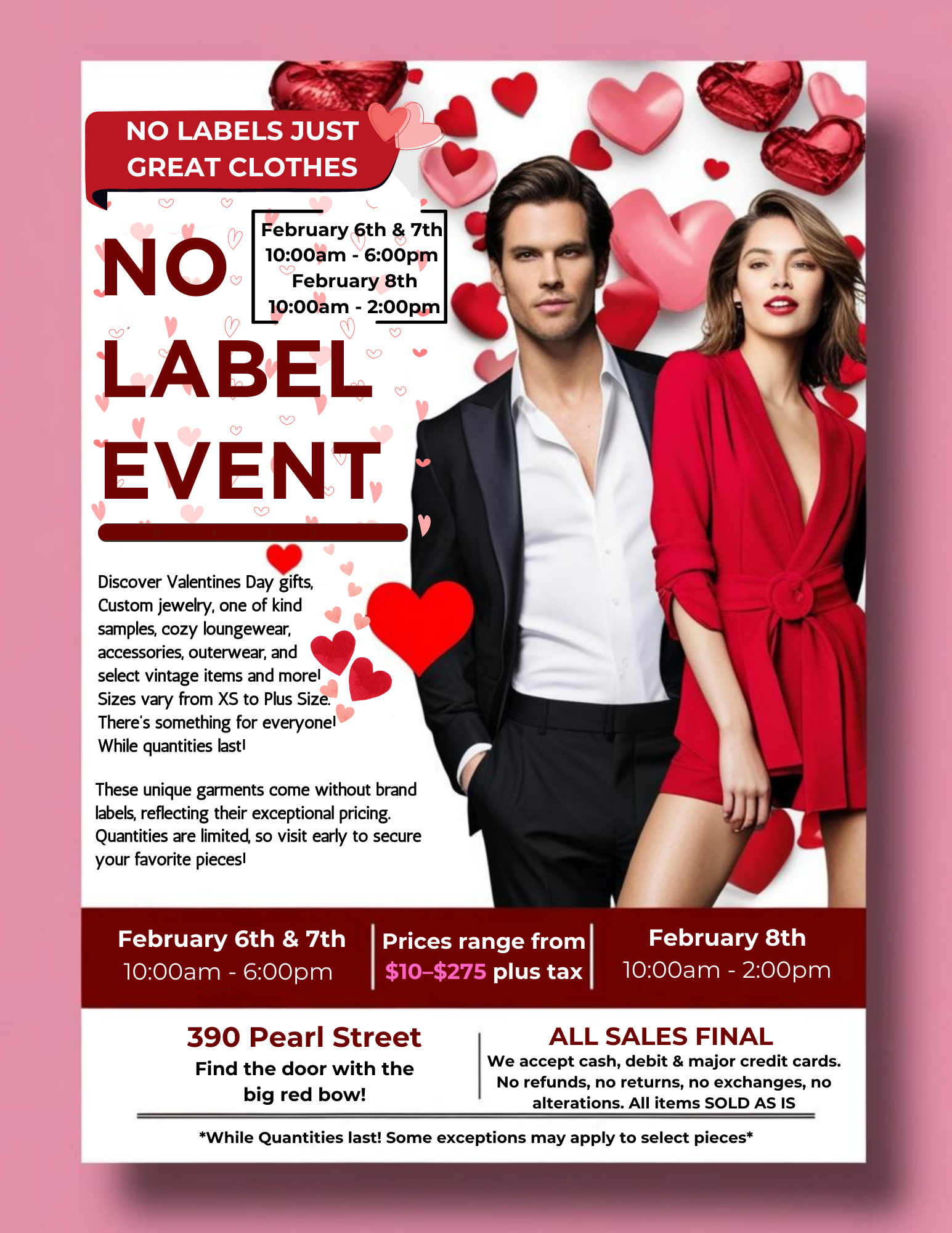 Come discover some Valentine’s Day gifts, costume jewelry, one-of-a-kind samples, varied sizes from XS to Plus Size, cozy loungewear, accessories, outerwear, select vintage items and more! there’s something for everyone! While quantities last! Limited quantity!