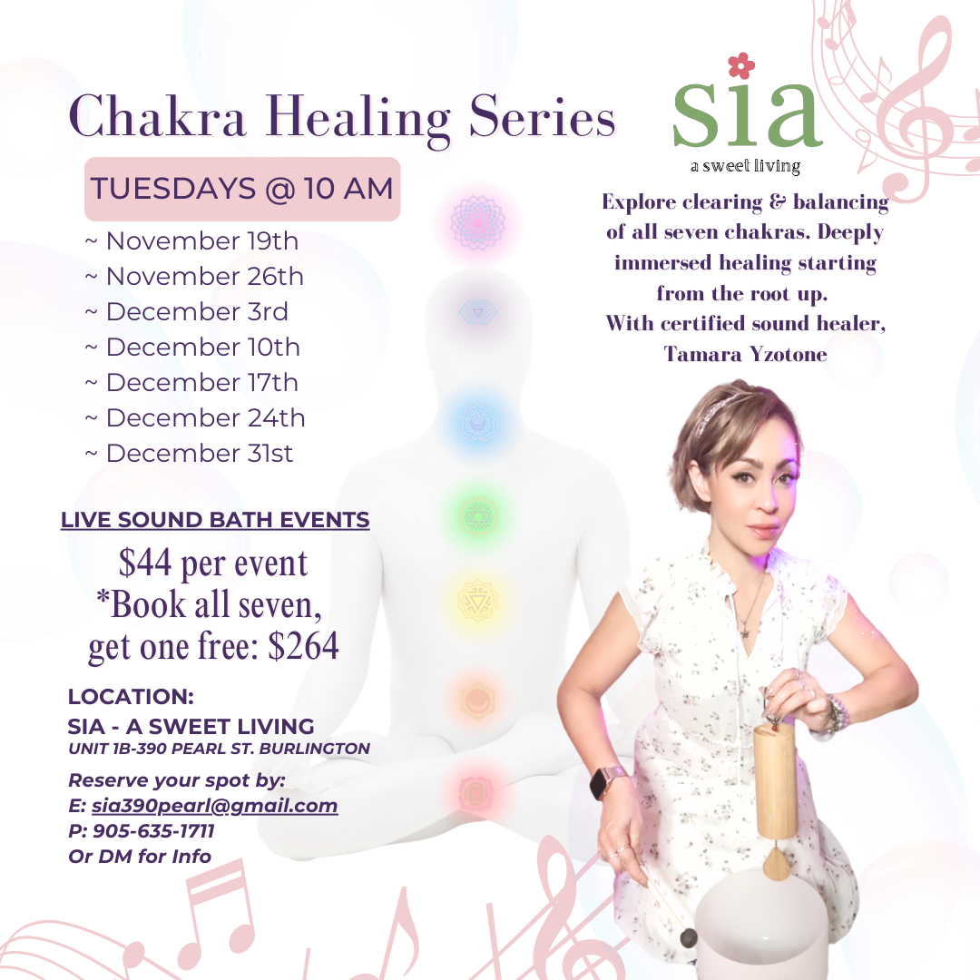 Welcome to the Chakra Healing Series – Guided Meditation & Sound Bath Event! Join us for a transformative experience every Tuesday mornings, starting on Tue Nov 19 2024 at 10:00 AM at Sia located at 390 Pearl St unit 1B in Burlington downtown. Let’s dive deep into our chakras and release any blockages through guided meditation and the healing vibrations of a sound bath.